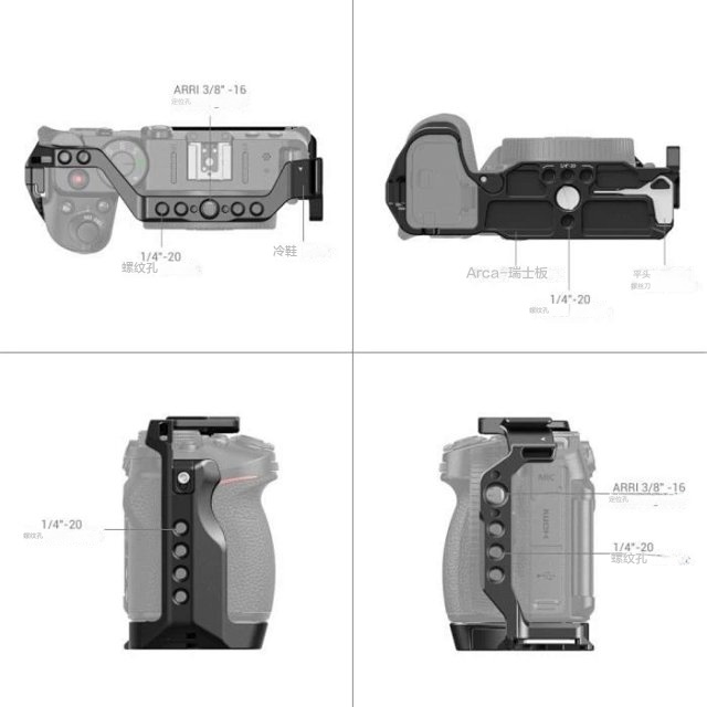 拓展框内置多个1/4 "-20螺纹孔、3/8“-16阿莱定位孔,可拓展上手提HTS2756、3765及侧手柄HSS2425,3814等进行手持拍摄,辅助运镜;兼容HDMI线夹1822,确保数据传输的稳定性。顶部内置冷靴接口,可拓展麦克风、补光灯等附件,辅助Vlog拍摄。