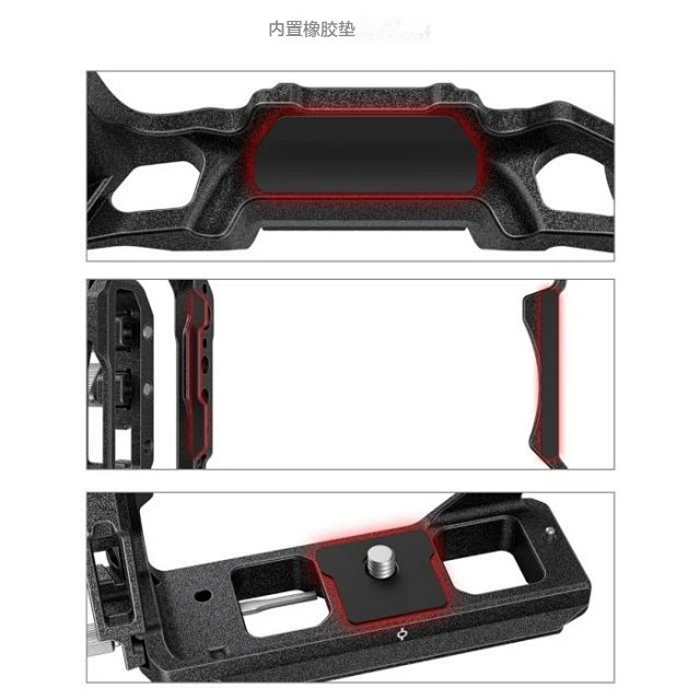 通过底部1/4螺丝、定位螺丝以及左侧肩带孔锁紧固定机身,防止偏转。多处内置硅胶垫片,保护相机,防刮花。