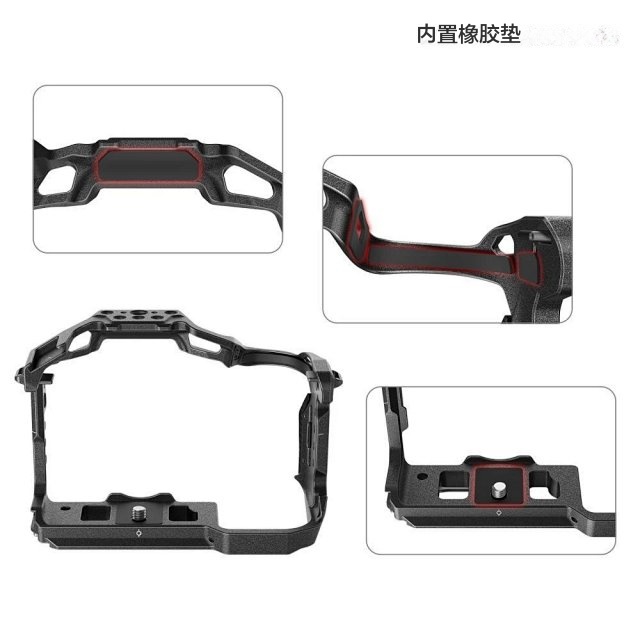 通过底部一颗 1/4”-20 螺丝、双侧定位压块锁紧相机,并多处内置硅胶垫片以防止刮伤相机。拓展框整体延续黑曼巴风格,可访问相机全部按键。