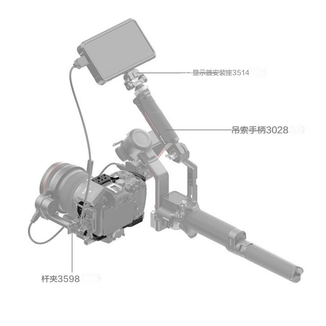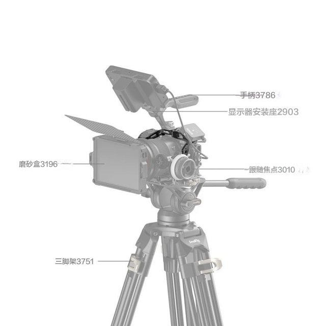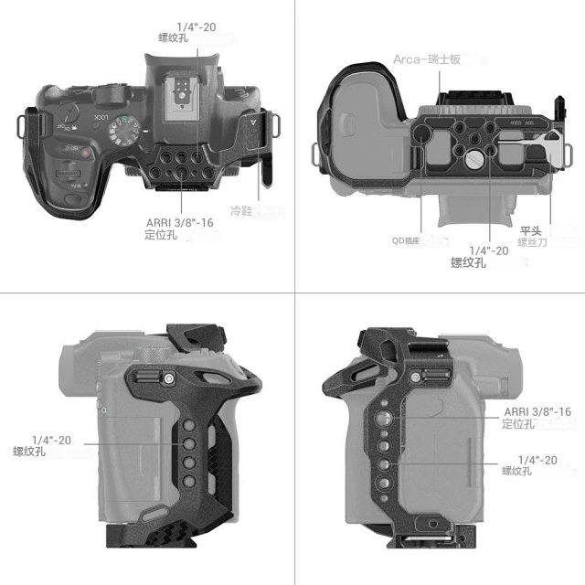 拓展框内置1/4”-20螺纹孔,阿莱定位孔可拓展侧手柄2093、3814,上手提3786,3765辅助相机运镜,魔术手2070,监视器支架2903,充电宝夹2336,管夹3598等;内置冷靴接口可拓展麦克风、补光灯;内置滑条接口,可拓展侧手柄3260、3813;内置腕带和肩带接口,可搭配腕带3848,肩带PSC2428使用。